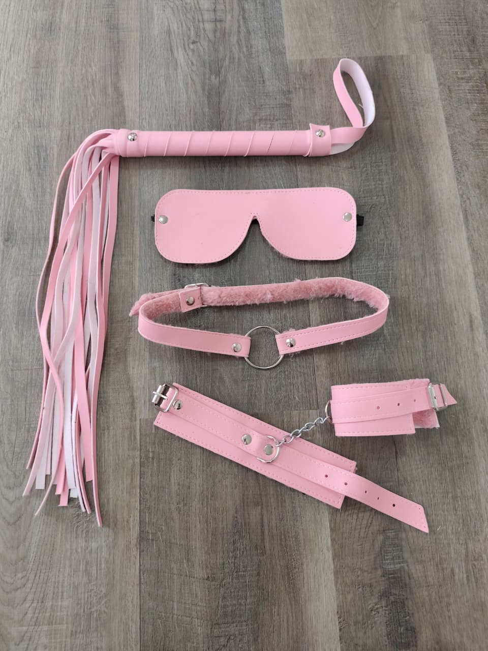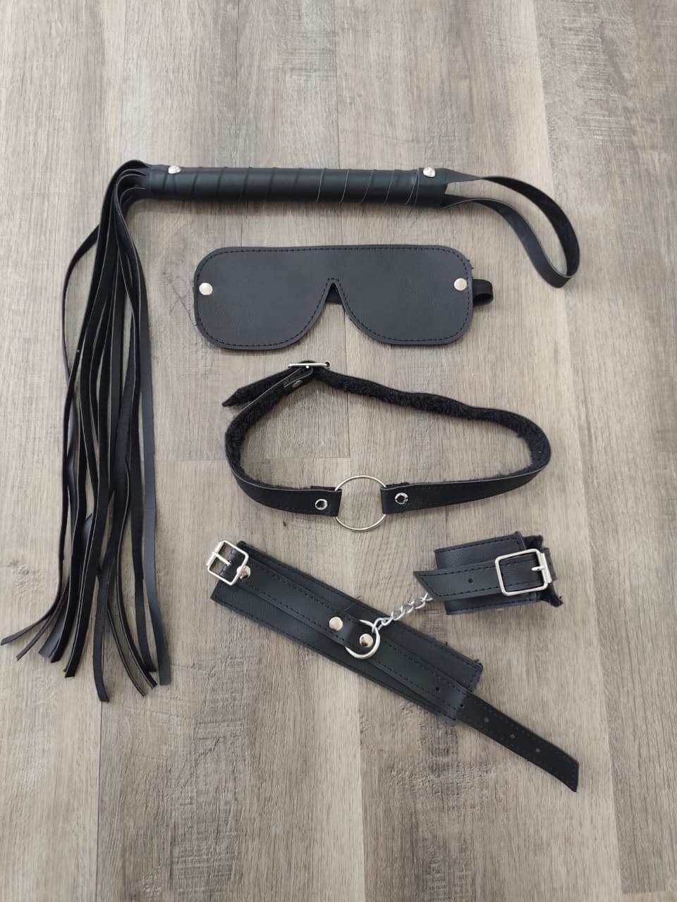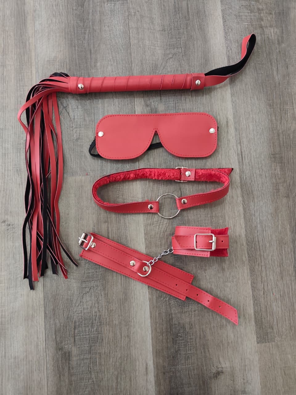 el kit INCLUYE 4 PIEZAS : ESPOSAS con plush – MORDAZA con plush – LATIGO – ANTIFAZ c on plush